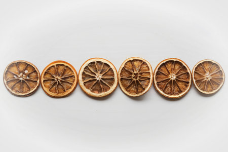 A line of dried orange slices arranged on a gray textured background, perfect for culinary themes.