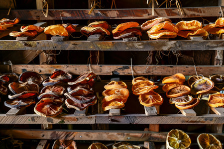 An AI generated illustration of oranges and dried peels hanging on wooden rack
