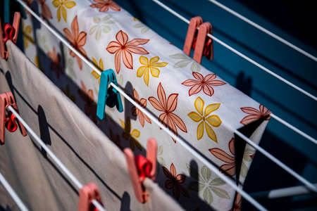 a colored tablecloth hangs on a clothesline among colorful clothespins..fabric in a flower hanging on a rope furnishing in the house