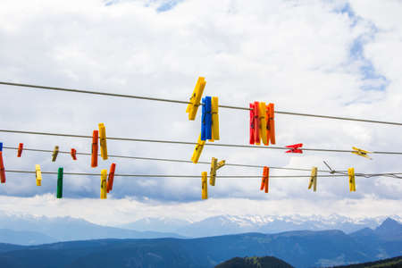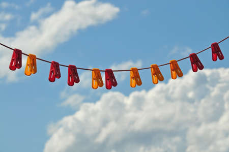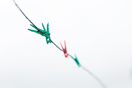 Clothespins holding clothes in laundry. clothespin on a string in a balcony. Abstract view