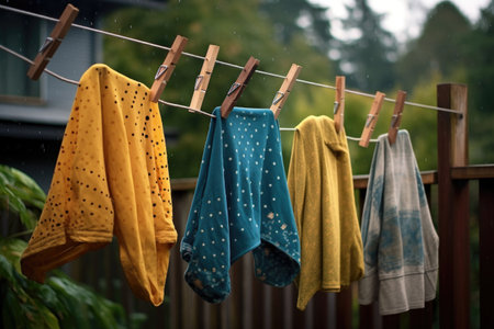 raindrops on clothes drying after a sudden shower, created with generative ai