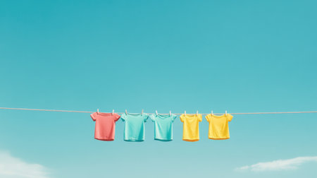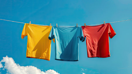 Brightly colored t-shirts hang on a clothesline, creating a cheerful atmosphere. The vibrant colors contrast beautifully against the clear blue sky, evoking summer vibes.