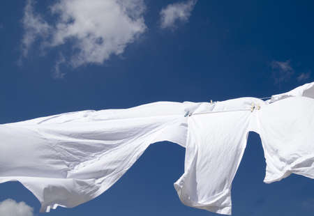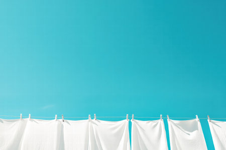 Freshly washed white clothes hang on a line, gently swaying in a warm breeze beneath a clear blue sky, perfect for adding text.