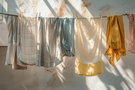 Fresh laundry airdrying on a washing line against a rustic wall in sunlight
