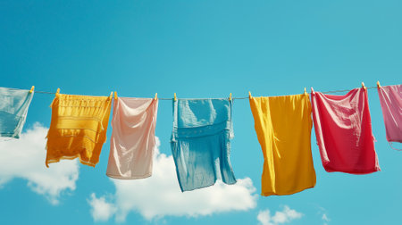 Casual clothes in various colors drying on a clothesline with a bright, sunny sky above, capturing an eco-friendly laundry scene.