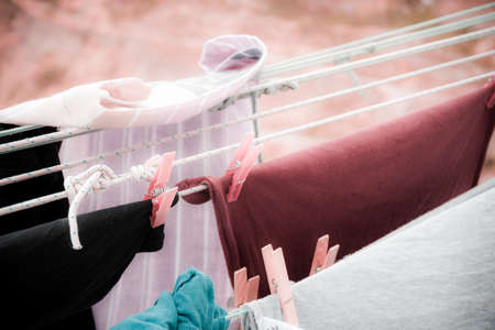 Clothes pegs or clothespins is hanging the underware on a cord. Plastic clothes pegs on a washing line