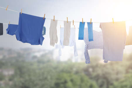 Freshly washed clothes hanging on the balcony with a bright blue sky professional photography