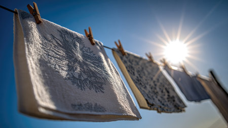 A beautiful scene of freshly washed towels hanging on a clothesline, illuminated by the bright sunlight against a clear blue sky, evoking feelings of cleanliness and tranquility.
