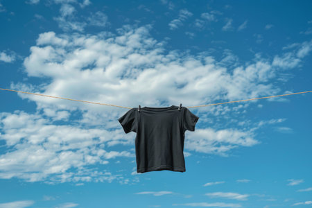 A black t-shirt is gently swaying on a clothesline, catching the sunlight as it contrasts with the vivid blue sky filled with soft, white clouds, creating a serene and peaceful atmosphere.