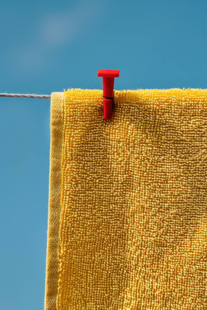 Bright yellow towel hanging on a clothesline, secured with a red clothespin against a clear blue sky. Summer and outdoor domestic life concept.