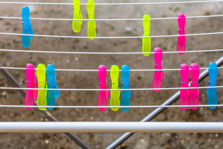 Colorful plastic clothes pegs on empty metal clothes dryer.