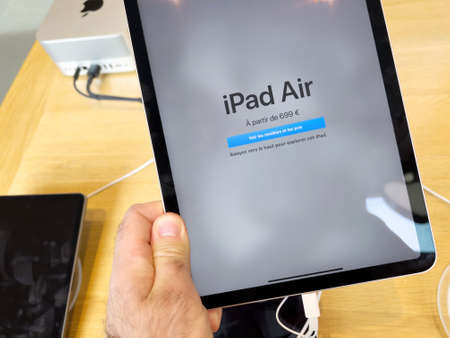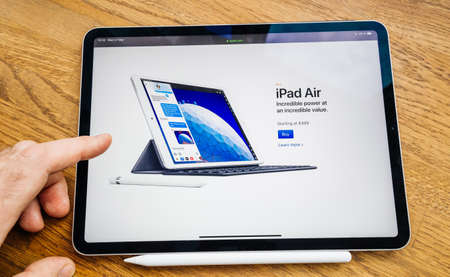 Paris, France Mar 27, 2019: Man hand POV looking at the new iPad Pro featuring Apple Computers website with latest Air tablet features and price