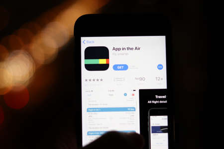 Los Angeles, California, USA - 28 November 2019: App in the Air app logo on mobile phone screen with blurry background, Illustrative Editorial.
