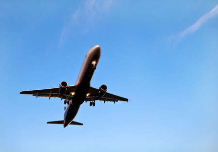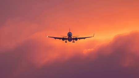 The silhouette of a passenger plane coming in for landing against the backdrop of the sunset sky.