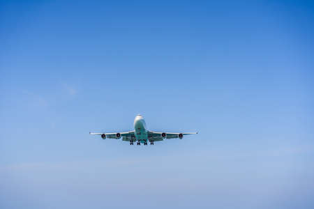 Under view of airplane for commercial passenger or cargo transporation flying on blue sky background with copy space