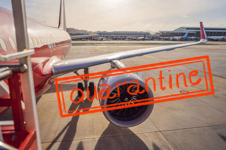Quarantine due to coronavirus epidemic covid19 Airplane wing and turbine on airport background