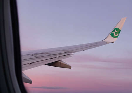 Amsterdam, Holland - Oct 8, 2018. Wing of Transavia Boeing 737-800 in sunrise. Transavia is a Dutch low-cost airline and a wholly owned subsidiary of KLM.