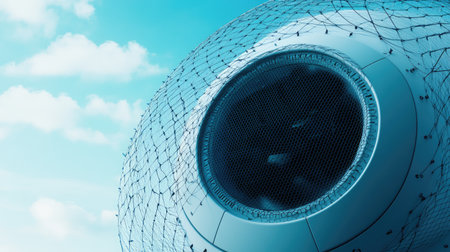 This image showcases a futuristic spherical design featuring a mesh overlay, set against a backdrop of a clear blue sky and softly scattered clouds.