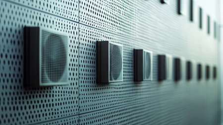 Air conditioning units neatly installed on a building exterior, highlighting advanced cooling technology in an urban setting.