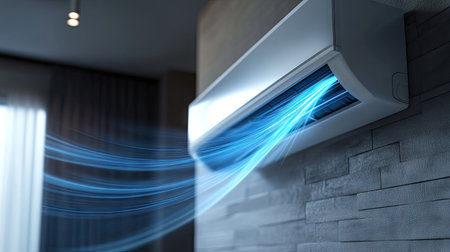 A sleek air conditioning unit mounted on a wall, emitting cool air in a modern indoor setting. Ideal for showcasing energy efficiency and home comfort.