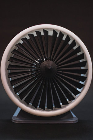 A close-up view of an aircraft jet engine turbine in operation, showcasing its intricate blades and central hub. generative ai