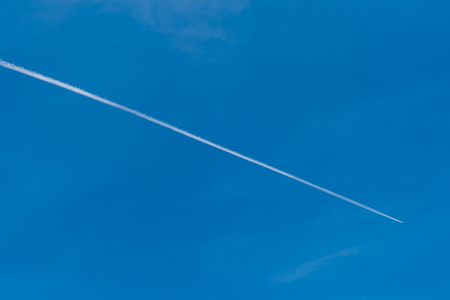 Long trace of the aircraft in the blue sky, the plane in the distance