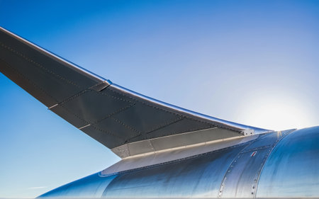 Close-up image of a commercial airplane wing with a transparent background. Perfect for aviation, travel, and transportation themes, capturing the sleek modern design and engineering of an aircraft.