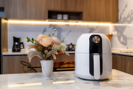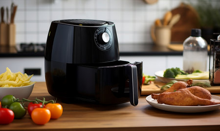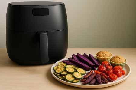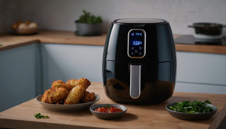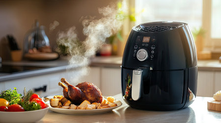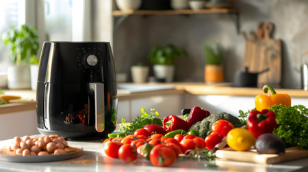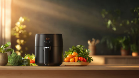 A sleek air fryer sits on a wooden countertop, surrounded by fresh vegetables and herbs. The warm natural light creates an inviting and stylish kitchen scene, perfect for healthy cooking.