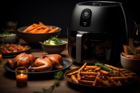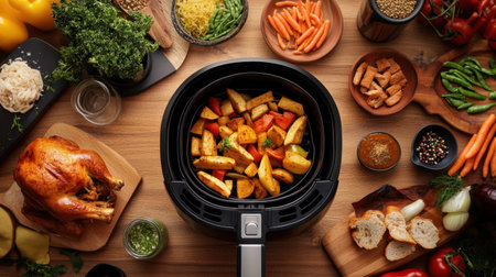 Delicious airfryer meals arranged on a kitchen table with plenty of space for copy, showcasing healthy and convenient cooking