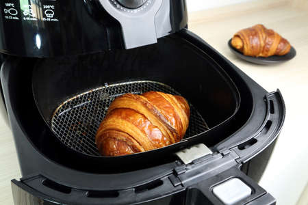 homemade croissaint are baked by using a black air fryer or oil free fryer appliance for being breakfast in the morning