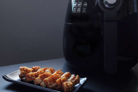 a black air fryer or oil free fryer appliance is on black wooden table in the kitchen with homemade deep fried crispy roast pork belly on white cement wall background during dinner in the party