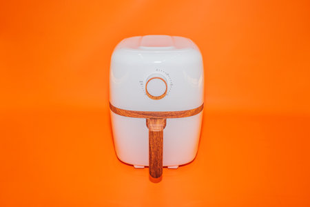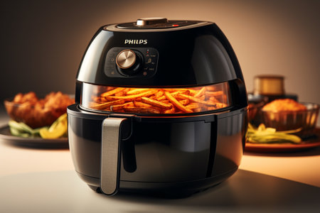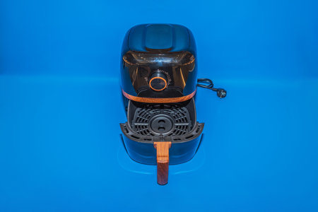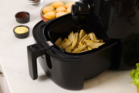 Close up flat lay image of an air fryer oven on kitchen countertop. This offers fast and easy crispy food with little or no fat by circulating hot air inside the basket. A healthy snack alternative.