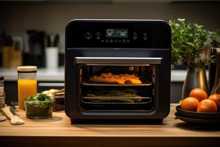 Cooking in a microwave oven on a wooden table in the kitchen, Close up flat lay image of an air fryer oven on kitchen countertop, AI Generated