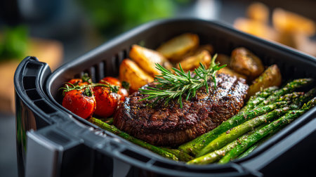 Dinner is prepared using an air fryer in a modern kitchen. The plate includes meat, asparagus, tomatoes, and potatoes. This meal supports fitness and nutrition goals.