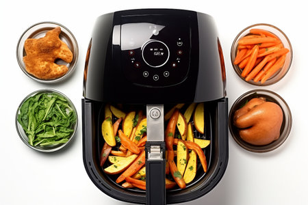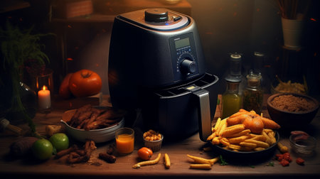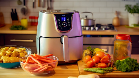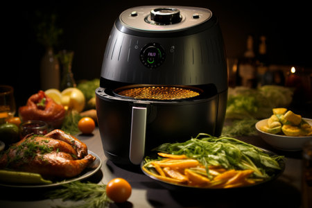 Modern electric air fryer with fresh vegetables on the kitchen table. AI Generative
