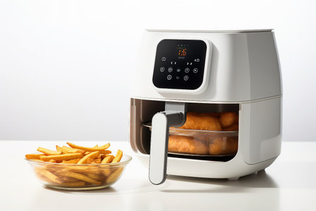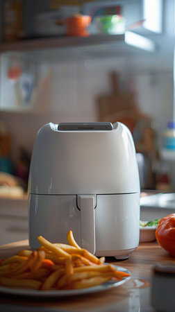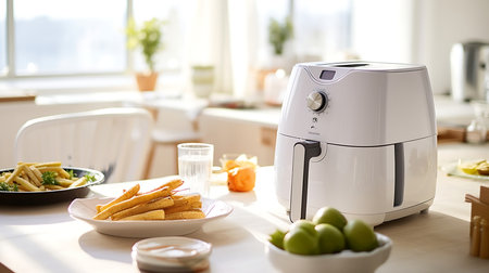 White Air Fryer in Kitchen with French Fries, Modern Cooking Appliance.