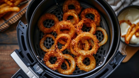 A vibrant display of freshly cooked crispy onion rings presented in an air fryer. Perfect for snacking or as a side dish in various meals.