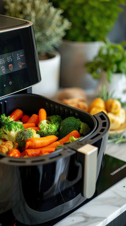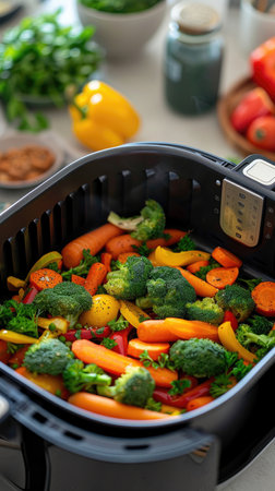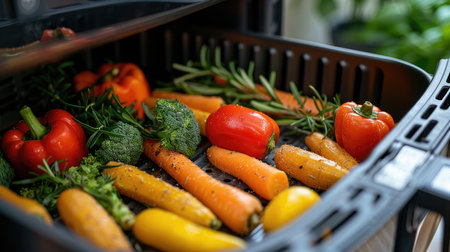 A mouthwatering display of colorful roasted vegetables in an air fryer, emitting steam in a contemporary kitchen, showcasing healthy cooking techniques.