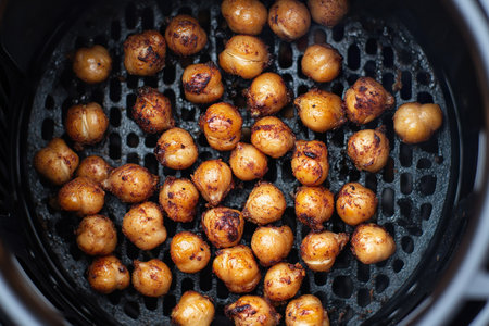 Crispy garlic roasted chickpeas in an air fryer from a top view