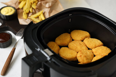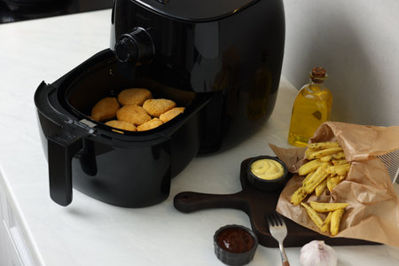 Air fryer with chicken nuggets, French fries, sauces and oil on white marble countertop, closeup