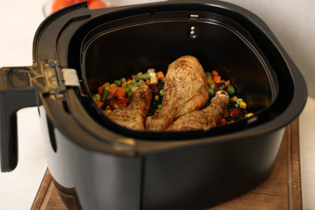 Air fryer basket with cooked chicken drumsticks and vegetables on table, closeup