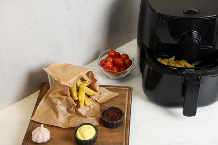 Air fryer, cooked French fries, tomatoes, sauces and garlic on white marble table, closeup