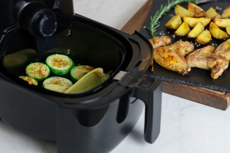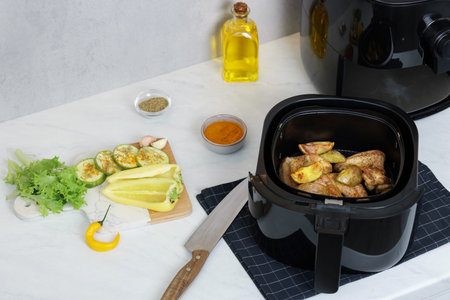 Air fryer with grilled vegetables, chicken wings, potato wedges and spices on white marble table, closeup