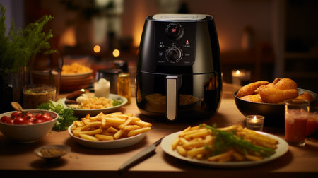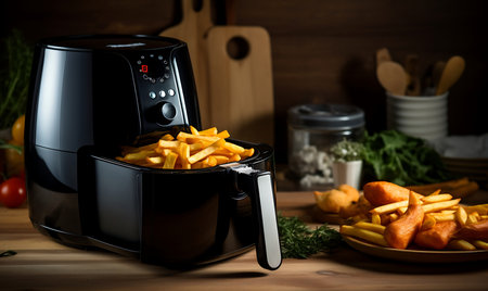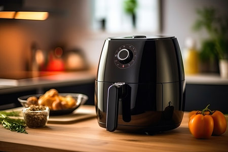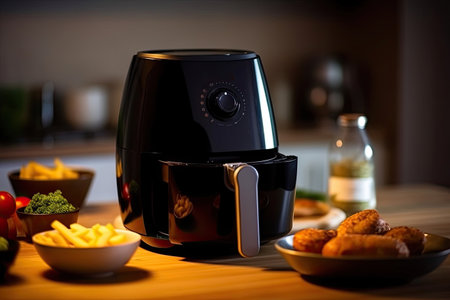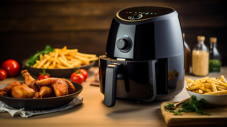 Air fryer oil free, a black air fryer or oil free fryer appliance is on the wooden table in the kitchen at home. Generative Ai