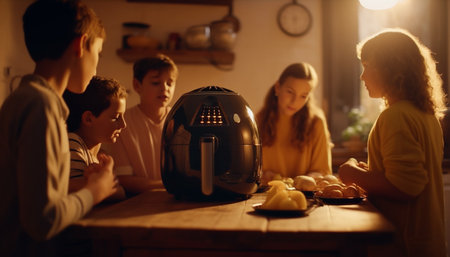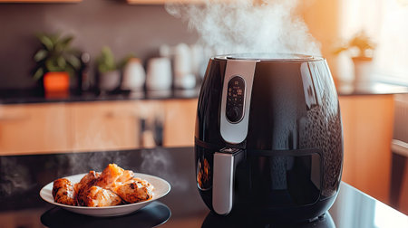 Modern black-and-chrome air fryer displayed on a countertop with food steaming beside it, offering a cozy dinner scene