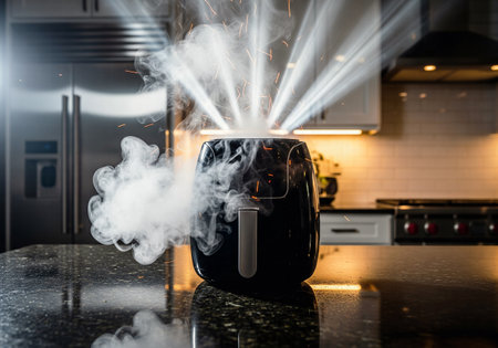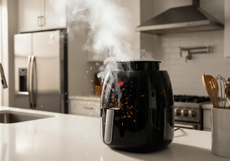 Air fryer short circuiting and smoking with sparks flying in a modern kitchen