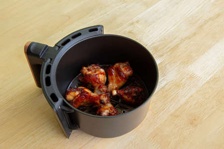 A mouthwatering close-up shot showcasing juicy and flavorful chicken wings expertly grilled to perfection, Frying BBQ chicken wings in a hot air fryer, AI Generated