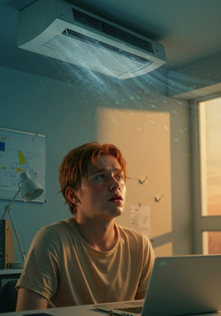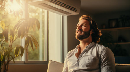 Young man is looking up toward an air conditioner unit, feeling relief from the heat in a room. Cool air brings comfort from hot summer weather in a home or office.