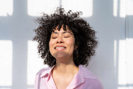 Beautiful latino young woman at home - Pretty south american with curly hair female portrait, lifestyle and domestic life scene