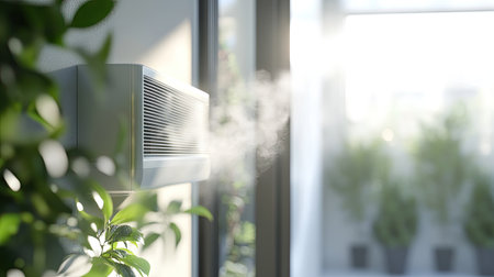 Close-up of a white air conditioner emitting a fresh, cool breeze that fills the air in a well-lit room.